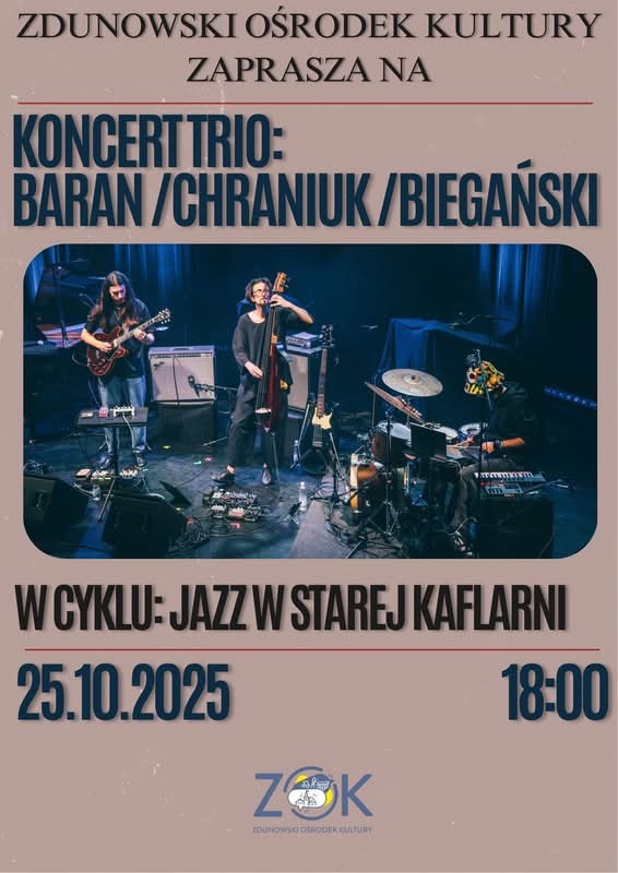 Zdunowski Ośrodek Kultury zaprasza na koncert jazzowy Trio Baran-Chraniuk-Biegański, który odbędzie się w zdunowskiej Kaflarni w sobotę, 25 października o godz. 18:00.