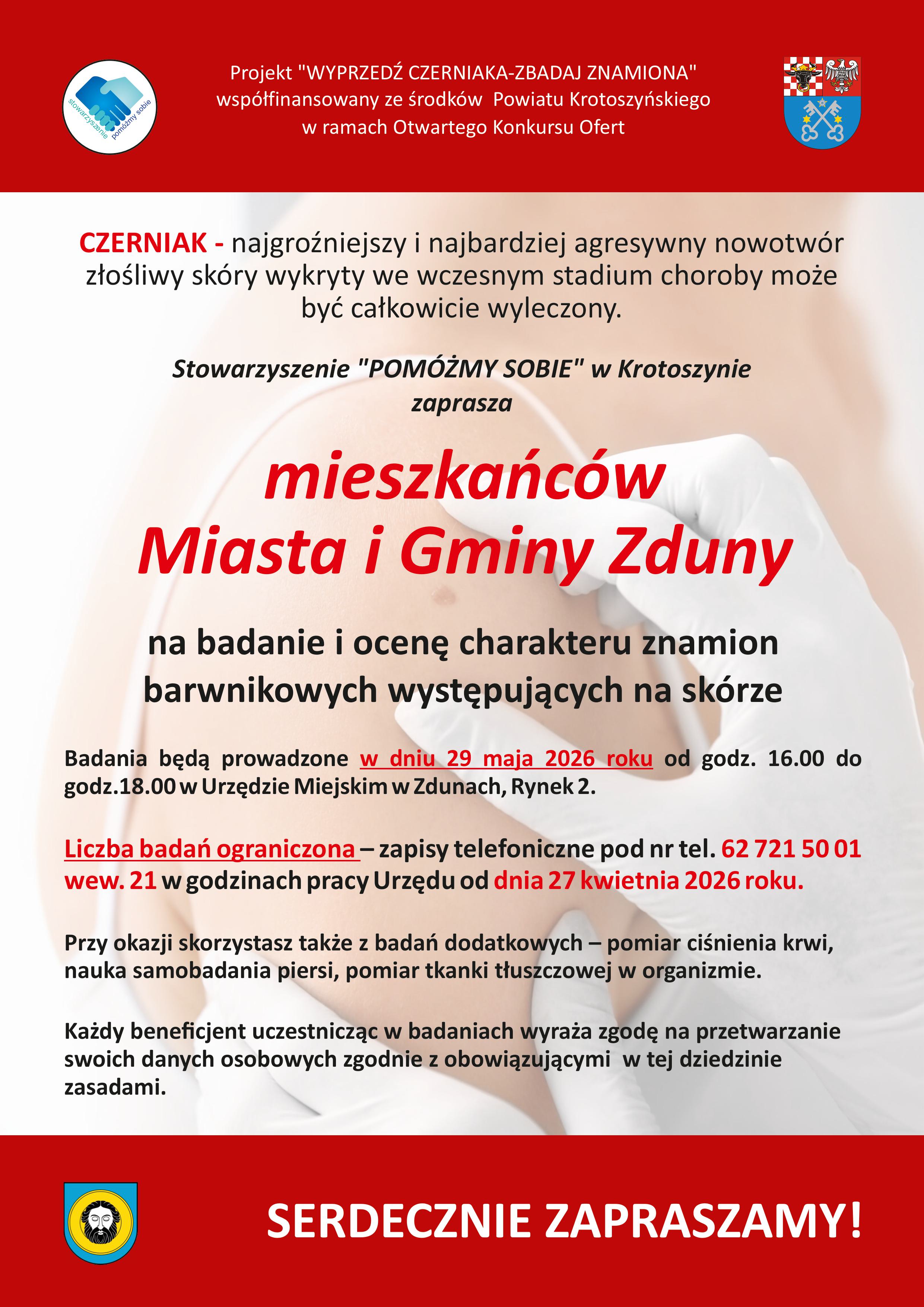 Stowarzyszenie „POMÓŻMY SOBIE” przygotowało dla mieszkańców Gminy Zduny kolejną akcję profilaktyczną. Tym razem w ramach dofinansowanego przez Powiat Krotoszyński projektu „Wyprzedź czerniaka - zbadaj znamiona” sygnalizujemy potrzebę zadbania o swoją skórę i wyeliminowania zagrożenia czerniakiem, najgroźniejszą chorobą nowotworową skóry.