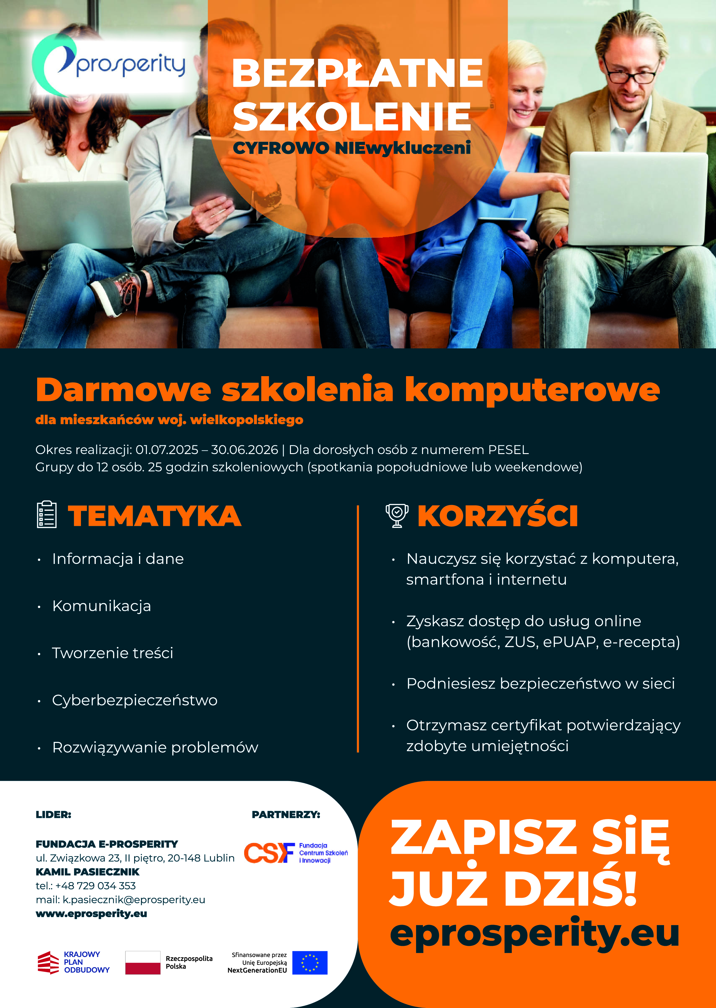 Projekt obejmuje bezpłatne szkolenia komputerowe, finansowane ze środków Unii Europejskiej w ramach inwestycji Krajowego Planu Odbudowy – „C.2.1.3. E-Kompetencje”.