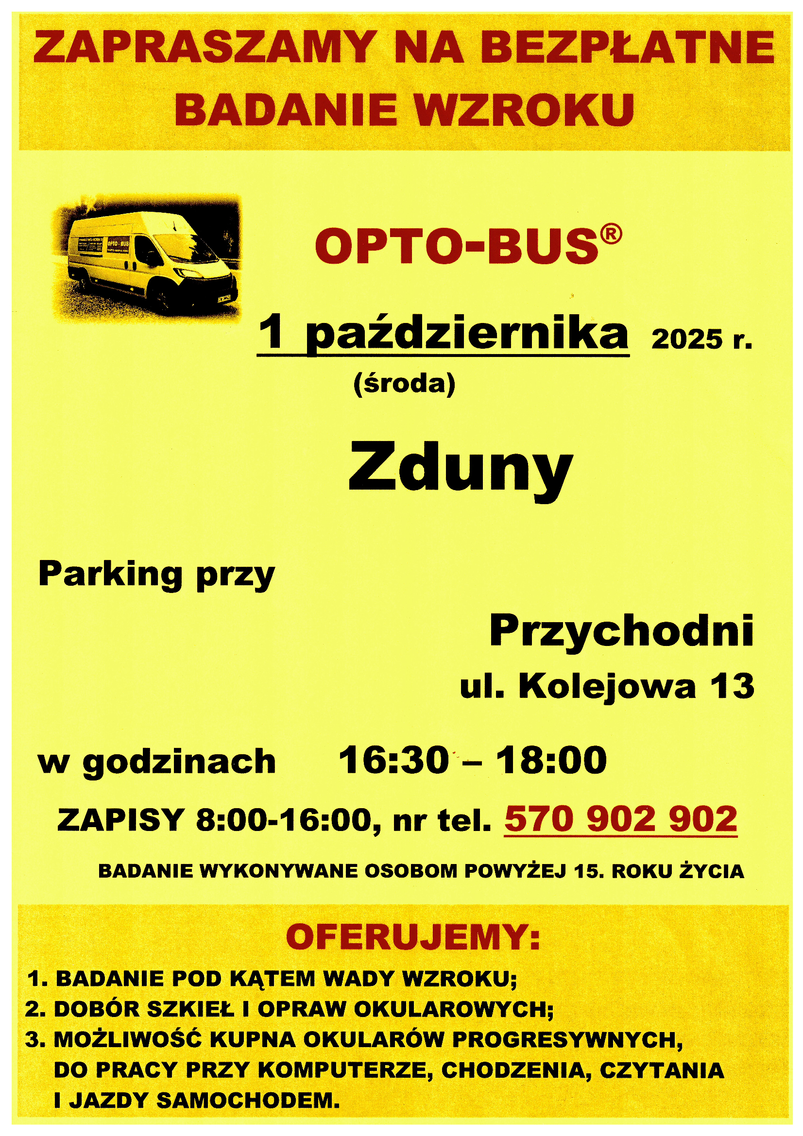 W dniu 1 października 2025 r. (środa) odbędzie się bezpłatne badanie wzroku w godz. 16:30 - 18:00 na parkingu przy przychodni (ul. Kolejowa 13 w Zdunach). Obowiązują zapisy pod nr tel.: 570 902 902.