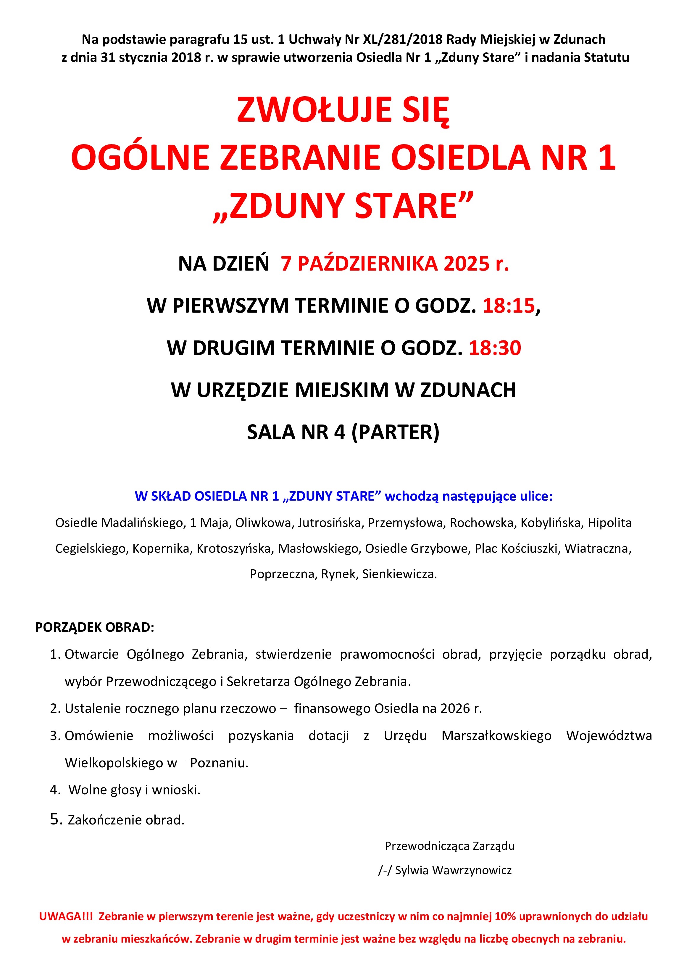 Na podstawie paragrafu 15 ust. 1 Uchwały Nr XL/281/2018 Rady Miejskiej w Zdunach z dnia 31 stycznia 2018 r. w sprawie utworzenia Osiedla Nr 1 „Zduny Stare” i nadania Statutu