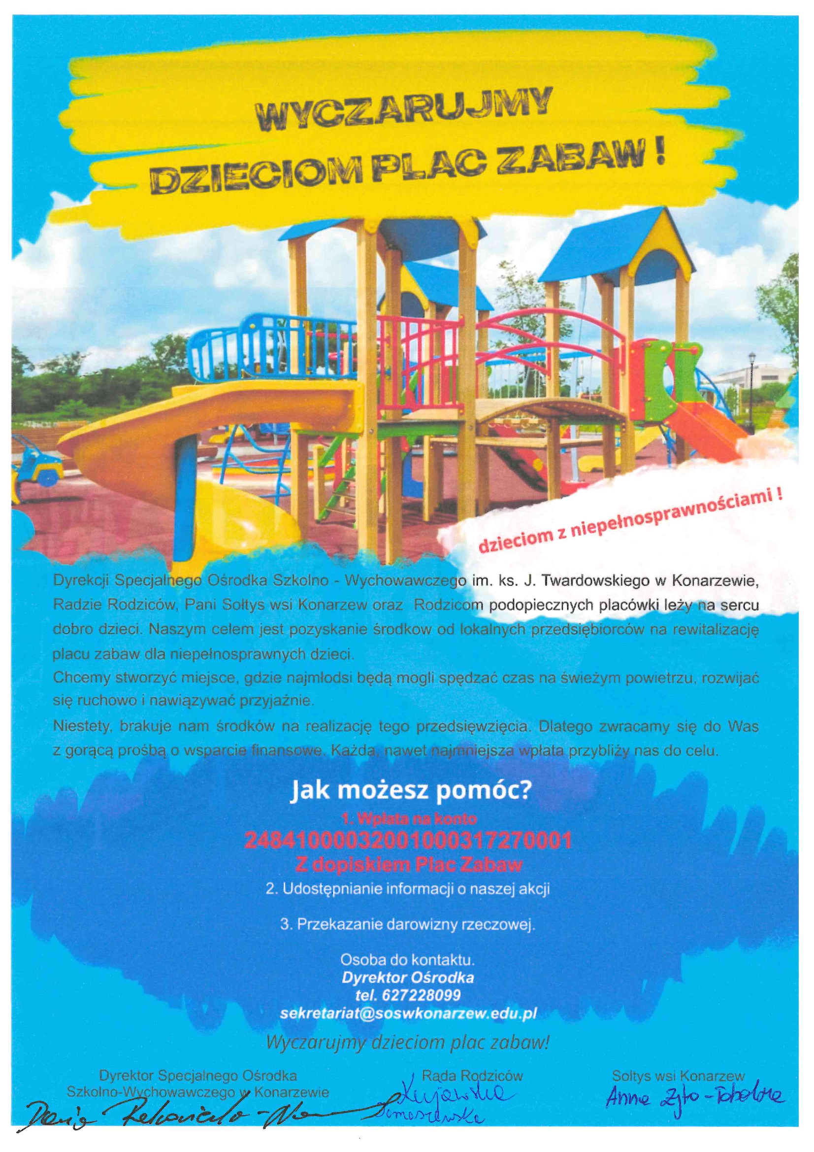 Dyrekcja Specjalnego Ośrodka Szkolno-Wychowawczego im. ks. J. Twardowskiego w Konarzewie wraz z Radą Rodziców, Sołtysem wsi Konarzew oraz rodzicami uczniów zwraca się z prośbą o wsparcie inicjatywy budowy placu zabaw dostosowanego do potrzeb dzieci z niepełnosprawnościami.