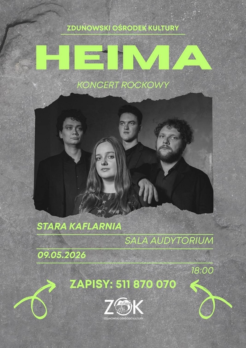 Zdunowski Ośrodek Kultury zaprasza na koncert rockowy zespołu Heima, który odbędzie się 9 maja br. o godzinie 18:00 w sali audytorium w Starej Kaflarni.