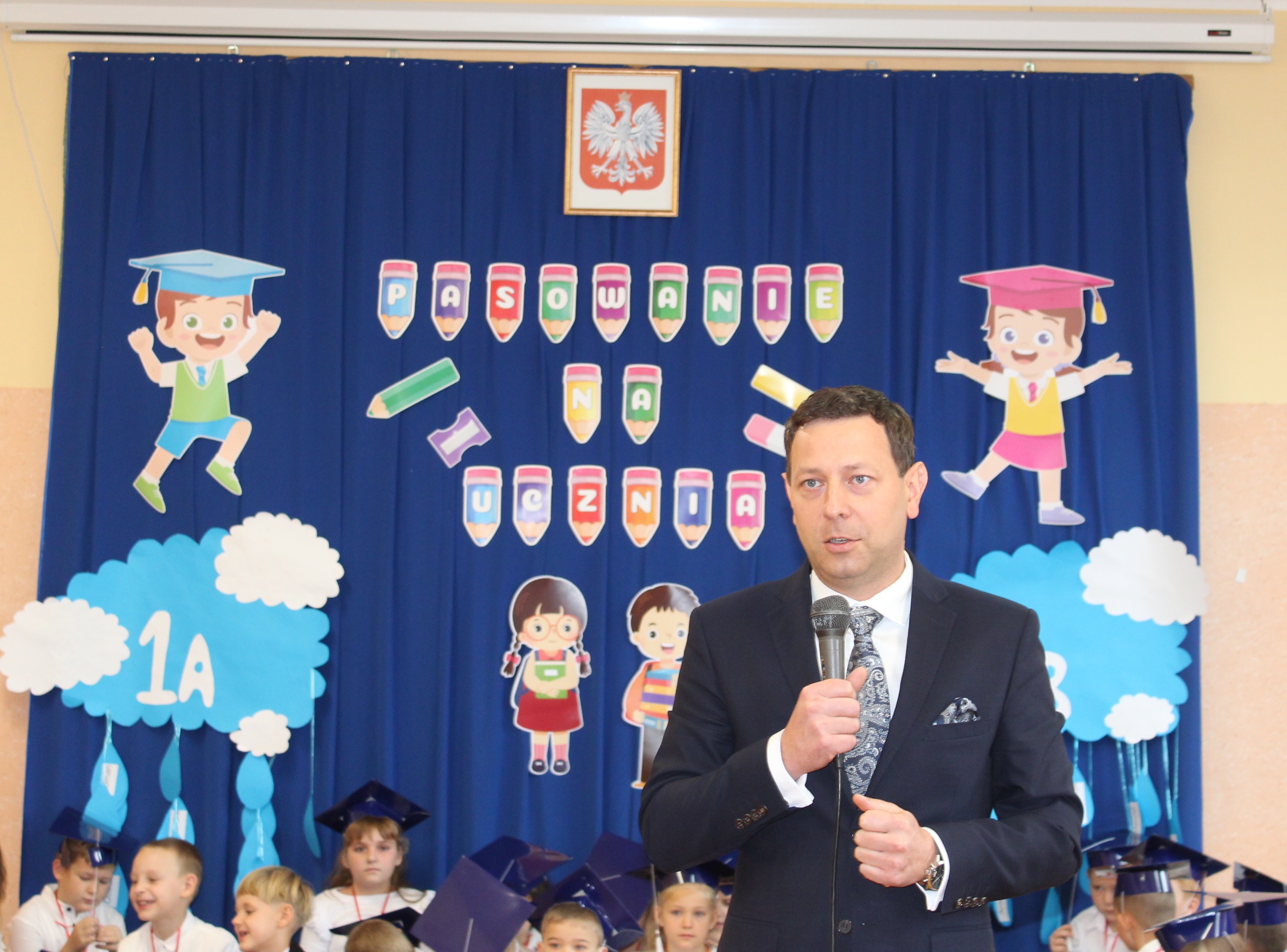 Po złożeniu ślubowania nastąpił najważniejszy punkt uroczystości – Dyrektor Andrzej Hejdysz dokonał aktu pasowania na uczniów Szkoły Podstawowej w Zdunach. W swoich wystąpieniach burmistrz Zdun i dyrektor pogratulowali dzieciom oraz życzyli im wielu sukcesów, radości z nauki i wiary we własne możliwości.